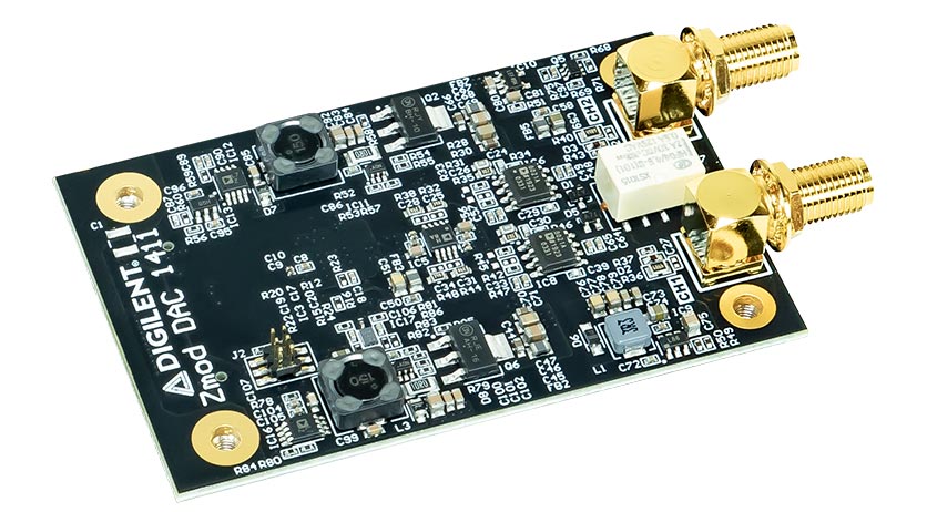 The Zmod AWG 1411 is equipped with Analog Devices AD9717 the dual channel, high speed, low power, 14-bit, 125MS/s Digital to Analog Converter (DAC). Driven by the SYZYGY carrier, the Zmod DAC can generate two simultaneous signals (50Ω, ±5V, single-ended, 14-bit, 100MS/s, 40MHz+ bandwidth). The analog outputs can be connected to a circuit using SMA cables.